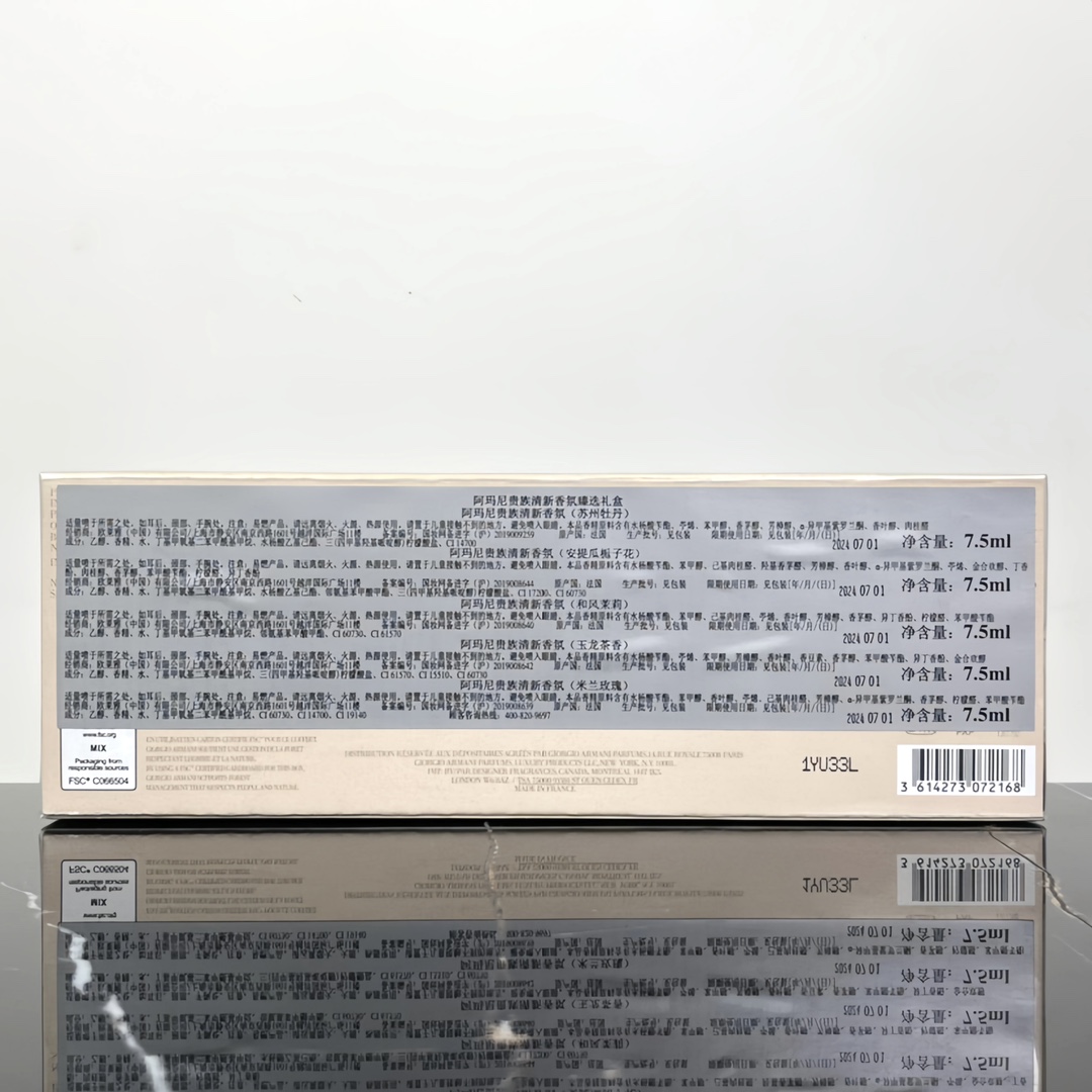 DetailThe five-piece fragrance set includes the following scents:Thé Yulong: Citrus Woody. The top notes are orange and lemon, the middle note is tea, and the base note is ambergris. Inspired by the Yulong Snow Mountain in Yunnan, China, it is a tea-scented perfume representing oriental elegance.Pivoine Suzhou: Fruity Floral. The top notes are mandarin orange, pink pepper and raspberry. The middle notes are rose and peony. The base notes are patchouli, musk and amber. This is a city perfume by Armani in tribute to the peonies in Suzhou, China, presenting the tenderness and grace of the misty Jiangnan region.Gardénia Antigua: Floral Musky. The top notes are bergamot, neroli oil and pink pepper. The middle notes are gardenia, jasmine and ylang-ylang. The base notes are patchouli, ambergris and musk. It is a fragrant tribute to the scent of gardenia, taking people back to the island of Antigua in their dreams.Rose Milano: Chypre Floral. The top notes are lemon and pear. The middle notes are rose, jasmine and lily of the valley. The base notes are sandalwood, patchouli and moss. This is Mr. Armani's tribute to Milan, his fashion hometown, showcasing the charm of fashionable women on the streets of Milan.Jasmin Kusamono: Floral Green. The top notes are pear and pink pepper. The middle notes are lily of the valley, jasmine and orange blossom. The base notes are cedar and sandalwood. Its inspiration and name come from Japanese floral art, reflecting Armani's love for the Asian minimalist aesthetic concept.