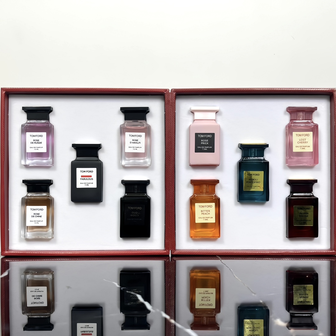 TF 10-piece 7.5ml perfume sample set with scents of Tobacco Vanille, Jasmin Rouge, Rose Prick, Bitter Peach, Lost Cherry, Eau de Fleur d'Oranger, Fucking Fabulous, Amalfi Rose, Russian Rose and Chinese Medicinal Rose.