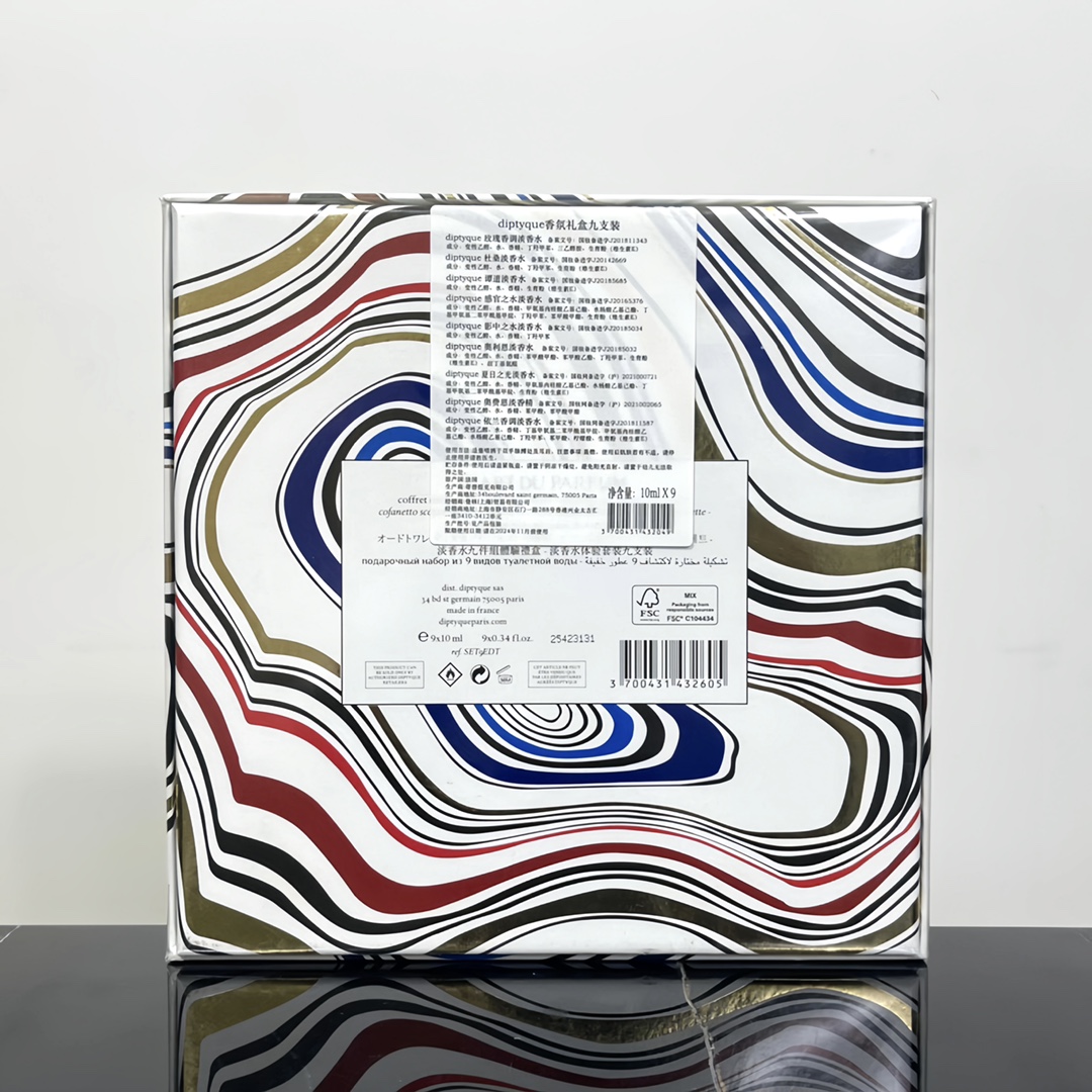 DetailThe Diptyque 9-Piece Colorful Miniature Perfume Set is a collection of 9 different fragrance samples launched by Diptyque. Each sample is 10ml and comes without a sprayer.The fragrances included in this set are Eau des Sens, Do Son Eau de Toilette, L'Ombre Dans L'Eau Eau de Toilette, Eau Rose Eau de Toilette, Oriens Eau de Toilette, Tam Dao Eau de Toilette, Ylang-Ylang Eau de Toilette, Eau de Minthé Eau de Toilette and Philosykos Eau de Toilette. There is also a saying that the set contains limited edition Eau Rose, limited edition Eau de Minthé, limited edition Lily of the Morning, limited edition L'Ombre Dans L'Eau, limited edition Do Son, limited edition Ylang-Ylang, White Tam Dao, White Eau des Sens and Black Philosykos.